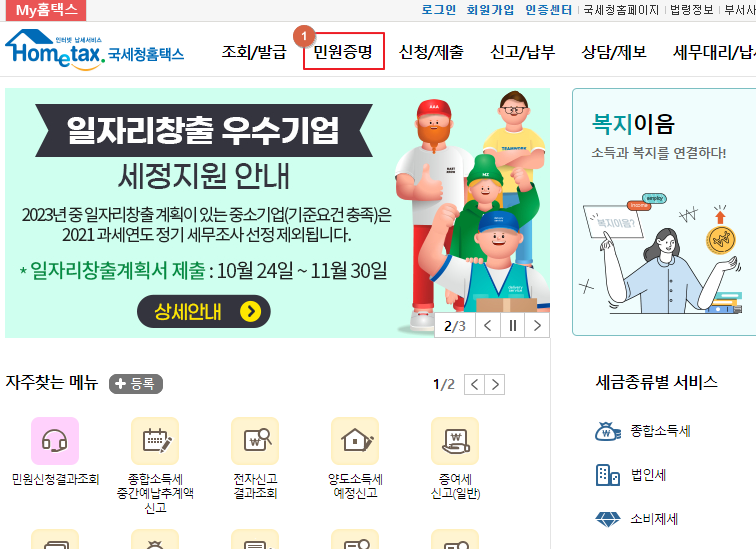 - 홈택스 메인화면에서 상단 메뉴 중 [민원증명] 메뉴를 선택하자.