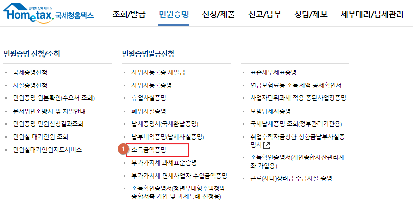 - 민원증명 메뉴를 선택하면 중앙에 [소득금액증명] 메뉴를 찾아 선택하자.